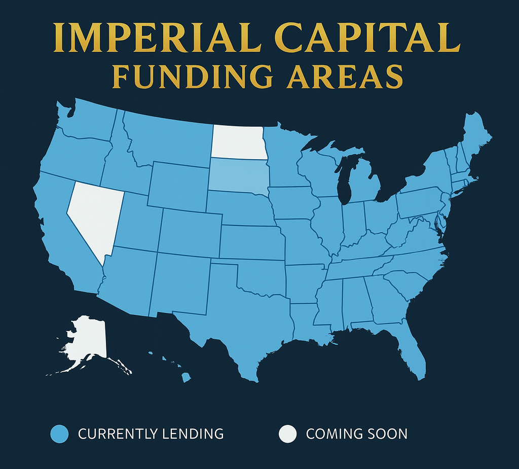 Imperial Capital Funding provides investor-focused financing across most of the United States. On the map above, blue states represent where we are actively lending today, while white states are “Coming Soon” as we complete licensing and program roll-outs.